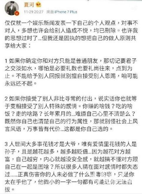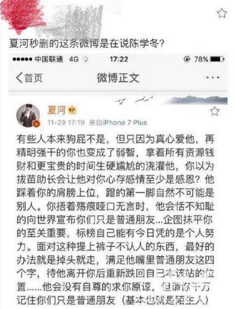 就在郭敬明转发微博否认移情汪铎,很多网友推测郭敬明和陈学冬在一起,之后陈学冬出来否认恋郭敬明,郭敬明也悄悄把转发微博删除了。接着昨晚夏河秒删了一条微博,有人猜测说的是陈学冬。