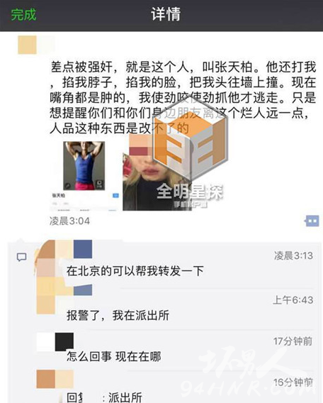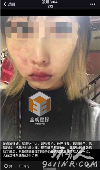 从爆料人提供的疑似受害人的朋友圈可以看到有这样一条:“差点被强奸,就是这个人,叫张天柏。他还打我,掐我的脖子,掐我的脸,把我往墙上撞。现在嘴角都是肿的,我使劲咬,使劲抓他才逃走。只是想提醒你们和你们身边朋友离这个烂人远一点,人品这种东西是改不了的。”