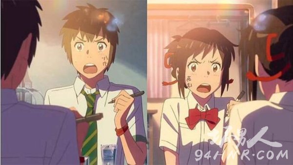 电影海报中,隐约暗示了泷与三叶有超萌身高差。仔细观察电影描述时空交错的暗示,当三叶鼓起勇气到东京找泷,完全没发现当时的泷只是国三生,双方在电车中面对面,当时2人是一样高的设定。而到故事中后段,泷终于见到三叶,这时他的身高已经高女方一个头,细腻交代了男主角国中到高中身体的变化。
