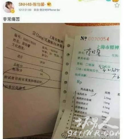 据了解,早在11月份陈怡馨在直播中就提到了退团的想法,但退团的原因一直不明了。不过万能的网友依然找到了不少蛛丝马迹。而12月初,陈怡馨发布一条微博随即秒删,陈怡馨只写了四个字“非常痛苦”,并晒出惊人的诊断单,诊断结果显示陈怡馨目前有重度抑郁症状。
