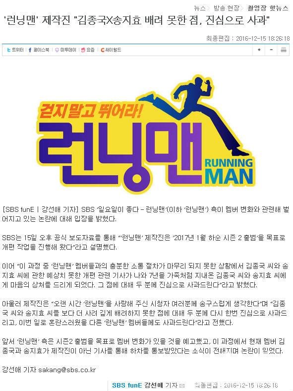 15日《Running Man》制作组方面通过官方报道材料就日前引起的成员变动风波发表了官方立场“以2017年1月下旬推出第二季为目标进行了改版准备工作,在这过程中还没能和成员们充分地沟通,便出来了关于改版的新闻,以致于给这7年来像家人一样相处的宋智孝金钟国带来了心里的伤害,对此节目组向两人表达真心的歉意。制作组对于这么长时间以来给予节目喜爱的观众也感到很愧疚。没能更好地照顾宋智孝和金钟国,再次向两位真心道歉,也向因为这次风波而混乱的其他成员表示歉意。”