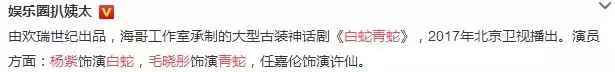 据某微博大V爆料,该剧定名为《白蛇青蛇》,由杨紫扮演白蛇,毛晓彤扮演青蛇,任嘉伦出演许仙。