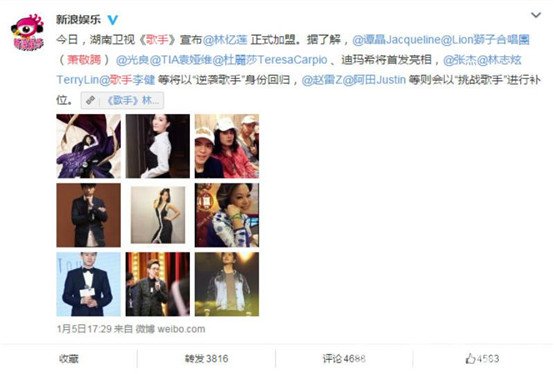 昨天,歌手林忆莲率先通过个人微博正式宣布加盟该节目。除林忆莲外,另已确定的是,歌手谭晶、萧敬腾、光良、袁娅维、杜丽莎、迪玛希会以首发阵容亮相。