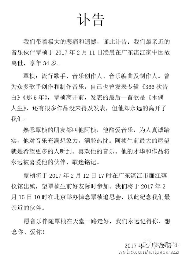 流行歌手、音乐创作人、音乐编曲及制作人覃桢于2017年2月11日凌晨因过度劳累导致心肌梗塞去世,年仅34岁。其经纪公司梦响当然发布讣告称:“愿你去的地方美好纯真,还有音乐为伴,在天堂一切安好…”