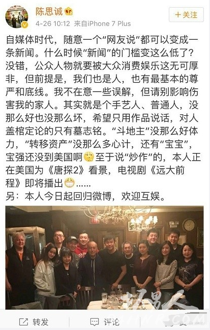 自媒体时代,随意一个“网友说”,都可以变成一条新闻。什么时候“新闻”的门槛变这么低了?没错,公众人物就要被大众消费娱乐这无可厚非,但前提是,我们也是人,也有最基本的尊严和底线。我不在意一些误解,但请别影响伤害我的家人。其实就是个手艺人、普通人,没那么好也没那么坏,希望只用作品说话,对人盖棺定论的只有墓志铭。“斗地主”没那么好体力,“转移资产”没那么多心计,还有“宝宝”,宝强还没到美国啊。至于说“炒作”的,本人正在美国为《唐探2》看景,电视剧《远大前程》即将播出……另:本人今日起回归微博,欢迎互娱。”