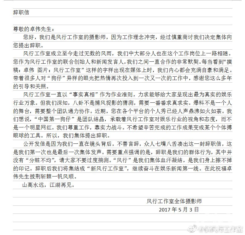 下午,新风行工作室发出了第一条微博,致信卓伟称:“尊敬的卓伟先生您好,我们是风行工作室的摄影师,因工作理念冲突,经过慎重商讨我们决定集体向您提出辞职”。