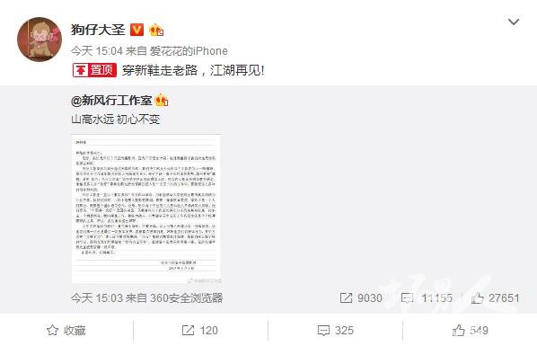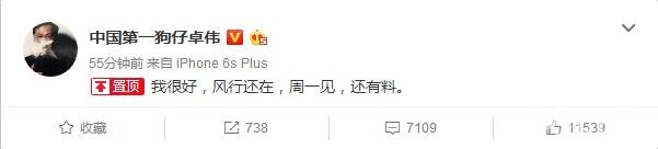 之后卓伟的徒弟“狗仔大圣”也转发此微博称,“穿新鞋走老路,江湖再见!”,确认了将要离开师傅卓伟自立门户的消息。卓伟对此回应称,我很好,风行还在,周一见,还有料。