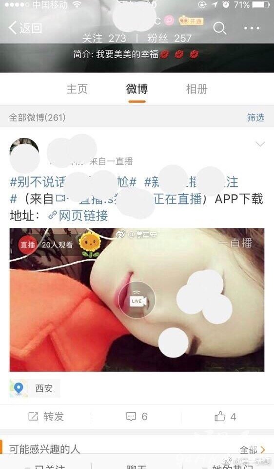 有网友爆料称西安直播洗澡女主播的微博名为@S猫猫cc,但目前这个微博名已经搜索不到了。