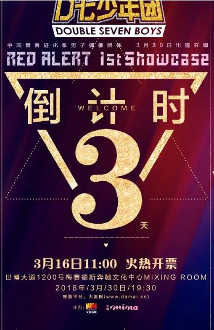 上海火核文化传媒有限公司即日发布:中国青春进化系男子偶像团体“D七少年团”(Double Seven Boys,www.d7boys.com)即将正式出道,将于3月30日在上海梅赛德斯奔驰文化中心Mixing Room举行出道首秀——DSB 1st Showcase,并于现场发布首张EP。