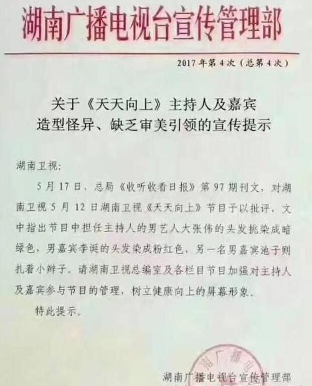 湖南广播电视台宣传管理部要求节目加强对主持人及嘉宾的管理,树立健康向上的屏幕形象。