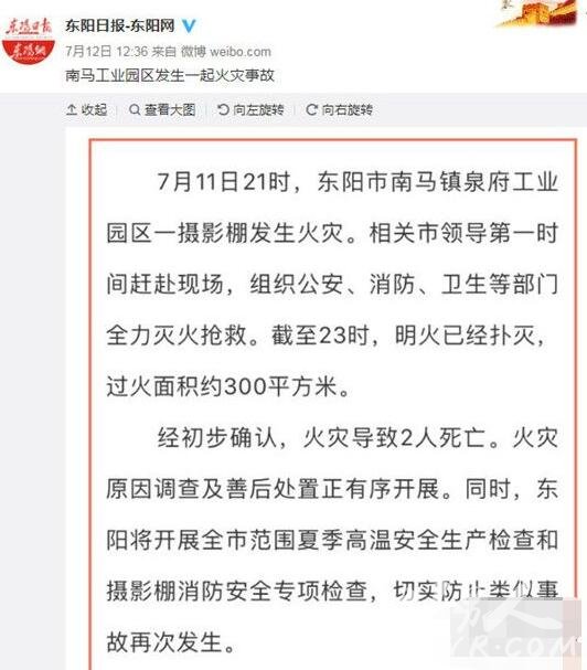 至当晚23时,明火已经扑灭,过火面积约300余平方米。经初步确认,火灾导致2人死亡。火灾原因调查及善后处置正有序开展。另据知情人透露,死者并非演员。