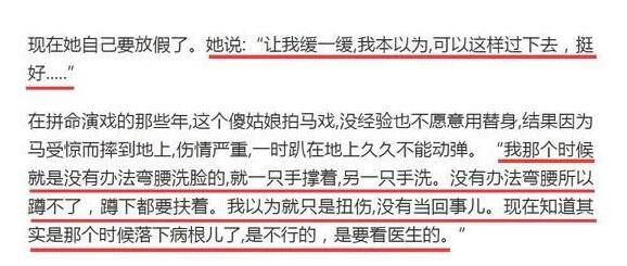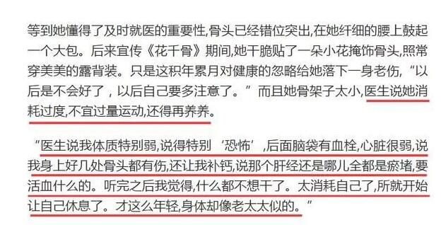 长年累月拍戏吊威亚,坠马后的旧伤成了难以痊愈的顽疾,现在的赵丽颖想想都有些后怕,透露称有看过医生,但医生说她体质特别弱,脑袋后面有血栓,心脏也很弱,身上好几处骨头都有伤还有缺钙迹象,拍戏还造成肝脏等部位有淤堵。医生给她的建议是:消耗过度,不宜再过量运动,还得再养养。一直以来赵丽颖对工作上都非常有责任心,演技也特别精湛,作为今年她最爆火的作品有《楚乔传》、《知否知否应是绿肥红瘦》、《密战》、《乘风破浪》等,相对来说这些作品都收视率都非常高,也获取观众很高的好评信息量,可想而知背后支持她的人还是很大的,根本不是大家能够单凭想象得出来的。