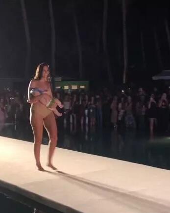 这位新妈妈身着单肩金色比基尼走在T台上,怀中抱着宝宝。宝宝头戴降噪耳机,也穿着绿色的比基尼和尿布。母亲走秀期间,一直在安静地吃奶。