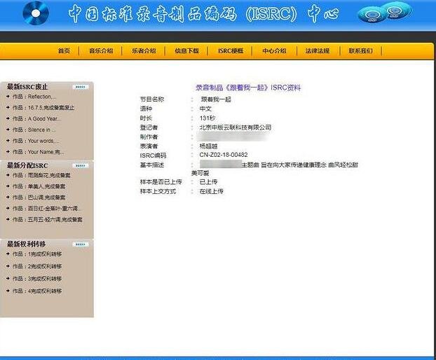 据中国标准录音制品编码(Isrc)中心资料显示,杨超越新歌《跟着我一起》样本已提交上传,这首歌曲时长131秒,据基本描述显示,该歌曲为某护咽产品主题曲,“旨在向大家传递健康理念,曲风轻松甜美可爱。”