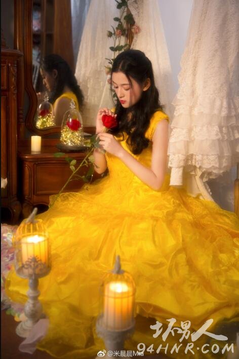 2017年的时候米晨晨晒出一组油画质感的“美女与野兽”主题照。照片中,米晨晨身穿柠檬色公主裙,时而静坐托腮看镜中的自己,时而手拿玫瑰拨弄花瓣,时而倚靠书架低头看书,浪漫古典气息扑面而来。