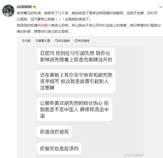 胡先煦同时出道考上中戏更是吸引一大波粉丝,不过胡先煦却又一个小小的梦想就是在大学交女朋友,好不容易实现了但是今天黑粉键盘侠的事情却再次出现了居然有人私信胡先煦的女朋友刁卓黑她而且居然HIA带上已经逝去的父亲让刁卓十分的生气发博斥责让我们去了解一下是怎么回事吧。