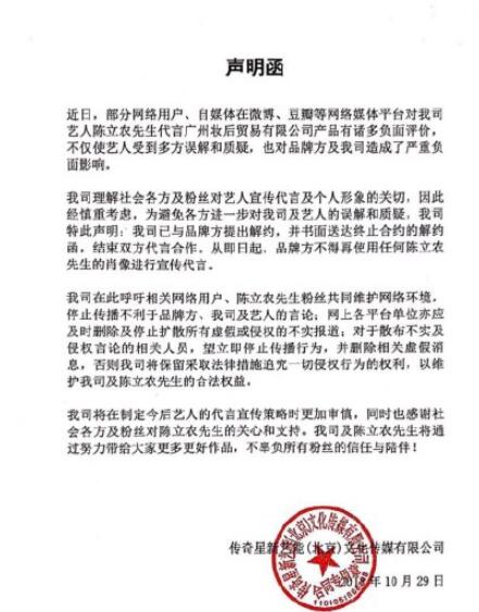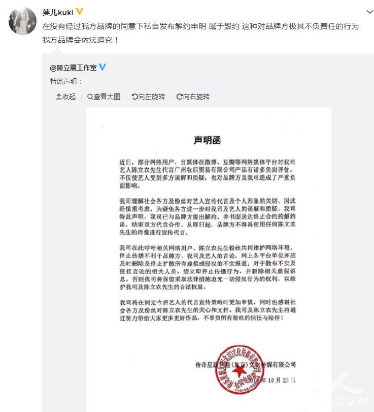 可是毕竟粉丝的力量是强大的所以陈立农的工作室马上就提出了解约的公告: