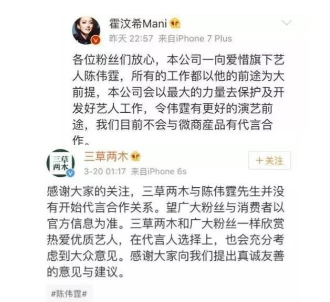 不过现在的微商也并非也是那么一无是处像韩束、一叶子是微商出身,各任代言人也是“大牌云集”。只要是效果好推荐给一向粉丝也未必是不可以的。这也不是第一次粉丝和微商闹矛盾了还有陈伟霆的粉丝也曾和微商三草两木闹过矛盾。