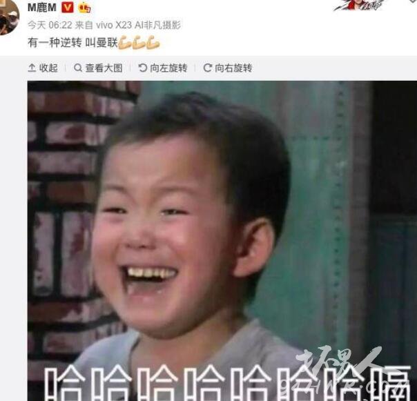 大家都知道鹿晗是非常喜欢足球的,而曼联就是他非常喜欢的球队之一,上个月初,曼联官方宣布鹿晗成为“曼联红魔使者”,他还落地曼联基地,化身“迷弟”打卡曼联球场,现场“追星”。!在今天凌晨曼联上演了大逆转,于是他的心情可以说是非常的好,于是鹿晗一大早在微博兴奋发文:“有一种逆转,叫曼联”,庆祝曼联3-1战胜巴黎,成功晋级欧冠四分之一决赛,实现逆转。这条微博还被曼联足球俱乐部官微转发。