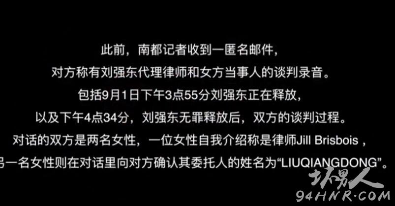 匿名录音曝光明州案女生向刘强东律师索要钱财。对此,接近刘强东的人士称音频内容属实。根据录音内容,对话的双方是两名女性,一名女性自我介绍称是律师Jill Brisbois,另一名女性并未提供个人信息,在对话中向对方确认其委托人的姓名是“LIUQIANGDONG”,并称“你可以告诉他,他可以给我一笔钱,我还需要他的道歉, 否则我就会去法院提起诉讼。”
