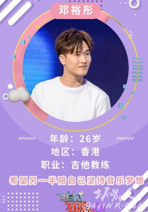 邓裕彤今年26岁,来自香港,目前是一名吉他教练,希望另一半陪自己坚持音乐梦想!颜值高,性格好,又会弹唱的超人气男嘉宾引得观察区女嘉宾纷纷热灯,每个男生身边都会有几个出馊主意的朋友!塬本无忧无虑的生活却突遭变故,幸好责任感和对音乐的喜爱让他走出阴霾……励志男嘉宾会获得女嘉宾们的青睐!可惜最后却没有牵手成功!