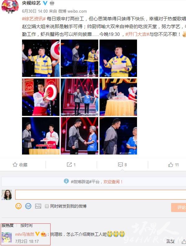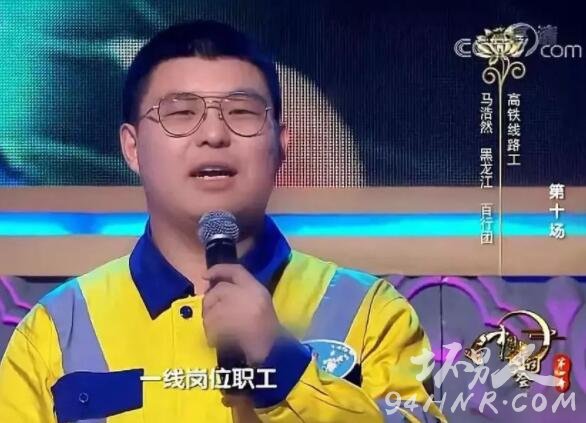 不知道在宣传的时候,为什么没有这位高铁工人,他在评论中写道要挑理,为什么不介绍这位高铁工人,是不是得罪了宣传的人了,还是认为他太出名了,不用介绍了,这是对选手的一种不尊重!虽然很多人在评论中写道致敬他!参加工作不久的马浩然是哈尔滨工务段的一名铁路线路工,主要工作是确保每辆高铁都能平稳地从铁路上驶过,人称“铁路医生”,只是这个“医生”一般上夜班。