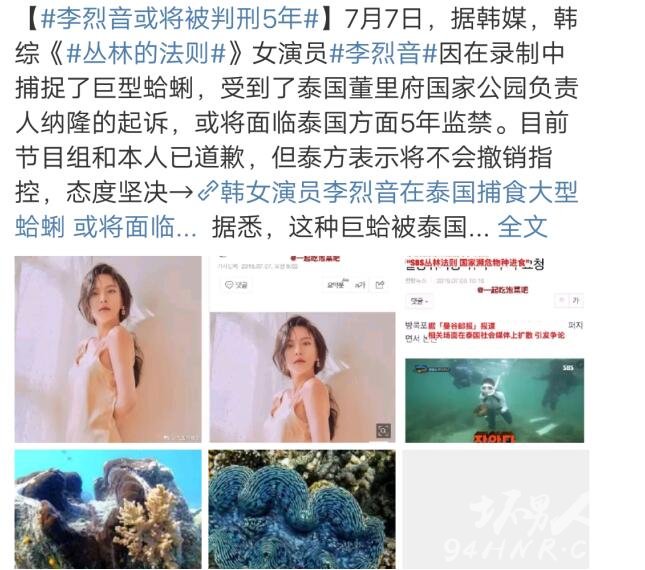丛林的法则是一档非常有名的韩综,不仅在韩国有庞大的观众基础,在中国也很受追捧。之前中国还买过该节目版权,拍摄了中国版的丛林的法则,只是节目效果一般就没有再继续下去。而此次李烈音捕捉巨型蛤蜊,违反了泰国法律,遭到了泰国警方指控。