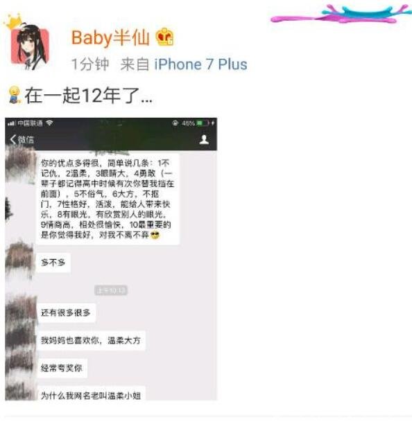 Baby半仙发了一条微博:“在一起12年了。。。”并贴出了一则微信的对话截图。似乎暗示自己已经心有所属了,难怪当时566哭了,难道566已经知道些什么了吗?