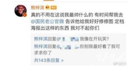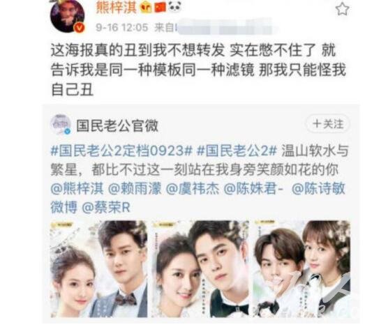9月16日,熊梓淇主演的新剧《国民老公2》官博公开了一组海报,熊梓淇转发怼官博修图丑:“这海报真的丑到我不想转发,实在憋不住了,就告诉我是同一种模板同一种滤镜,那我只能怪我自己丑。”随后他又将该条评论删除。