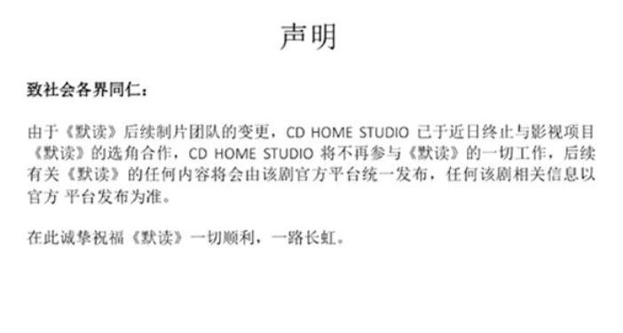 9月26日,默读选角计划暂停引起很多网友热议,9月25日,影视项目《默读》选角工作室CDHOME_STUDIO发布声明宣布选角计划暂停。声明表示由于《默读》后续制片团队变更,工作室于近日终止与项目的选角合作,工作室将不再参与《默读》的一切工作,后续相关内容将由该剧官方平台统一发布。