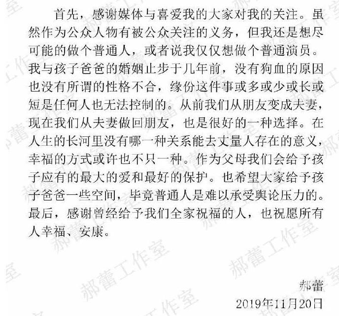 早些时候,郝蕾曾经向媒体表示:“他是个圈外人,不是我们这个职业的,所以还是不要打扰他的生活。”之后,郝蕾又直接在微博上晒出一张婴儿脚印图,并说道:“欢迎来到这个世界,兄弟俩肩并肩留下人生旅途中的第一个足迹。感谢佛菩萨的加持一切都是最好的安排。”没曾想现在已经各奔东西。
