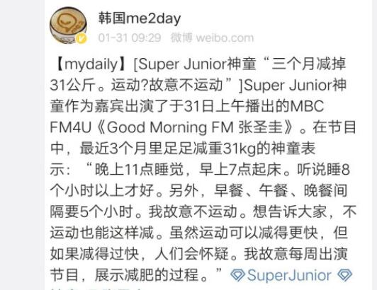 在1月31日的时候,就有网友发文称,SuperJunior神童三个月减掉31公斤,但近日才传到我国,运动?还是不运动?