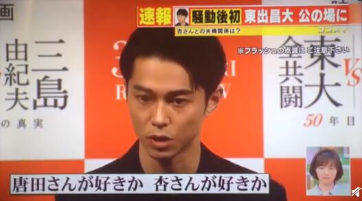 3月,东出昌大出席记者会,被问到更喜欢杏还是唐田时,沉默了12秒,随后称:“我现在把心中所想在这里说出来的话会伤害到妻子,所以恕难回答。