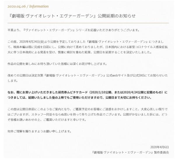 《紫罗兰永恒花园》新作剧场版动画原定于4月24日上映,京都动画在发表的声明中对本次延期致以歉意,并表示“这是全体工作人员怀着非同寻常的心情完成的作品”。这部《紫罗兰永恒花园》新作剧场版将延续TV版的主线剧情,将涉及基尔伯特少佐的下落。