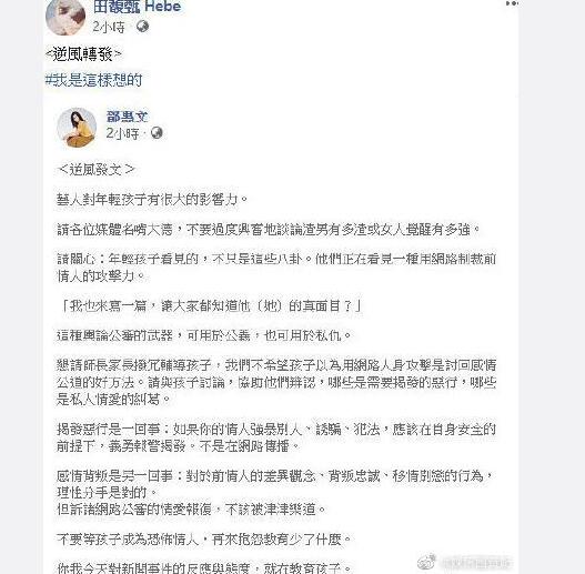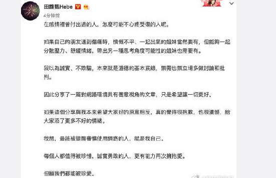 田馥甄Hebe发文谈罗志祥周扬青分手一事,有对周扬青感同身受,没有不站她,也没有维护罗志祥,只是从善意的角度出发,希望网络净化,而不是这件事本身!表示这事儿该私下解决,引发争议后,再次发文表示自己被误解,不过不管怎样作为公众人物更应该谨言慎行才对吧!