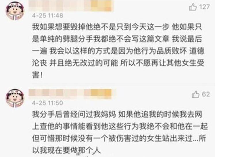 直接回怼称:“我如果想要毁掉他绝不是只到今天这一步,他如果只是单纯地劈腿分手,我都绝不会写这篇文章,我会以这样的方式是因为他行为品质败坏,道德沦丧,且绝无改过的可能,所以不愿再让其他女生受害!”