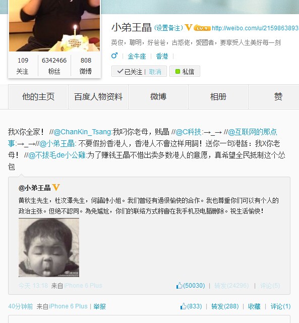王晶的微博发出后,引来众多网友的的围观,其中有不少指责的声音。而王晶也在微博持续发飙,与这些网友展开骂战,其中有不少如“我X你全家”之类的粗口。