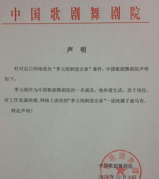 与此同时,中国歌剧舞剧院也对此次“出家”谣传发出郑重声明:“作为中国歌剧舞剧院的一名演员,李玉刚热爱生活,忠于岗位,对工作充满激情。网络上流传的‘李玉刚剃度出家’一说纯属子虚乌有。”