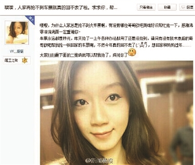 抢票难,难倒众多美女好汉。近日,广州一网名为“VV灬薇薇”的90后美女(如图)在多次抢票失败后,突发奇想在网上发帖求抢票,半小时时间引来4000多回帖,有700多人应声而动,不到2分钟抢到8张火车票。 网友感慨:看来长得好看才有车票,长得丑只能走回家了。