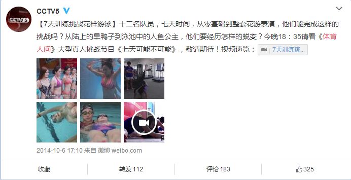 【7天训练挑战花样游泳】十二名队员,七天时间,从零基础到整套花游表演,他们能完成这样的挑战吗?从陆上的旱鸭子到泳池中的人鱼公主,他们要经历怎样的蜕变?今晚18:35请看《体育人间》大型真人挑战节目《七天可能不可能》,敬请期待!
