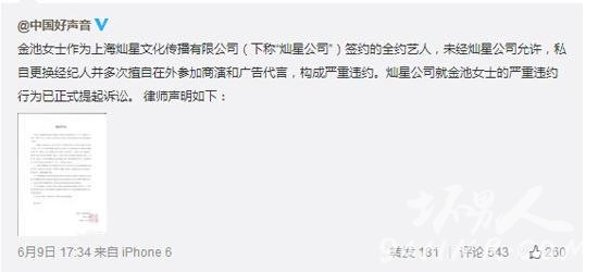 上海市广海律师事务所姜海立律师受上海灿星文化传播有限公司(下称“灿星公司”)委托,就金池(姓名:李素萍)女士严重违反与灿星公司的独家演艺经纪合同事宜郑重发表声明如下: