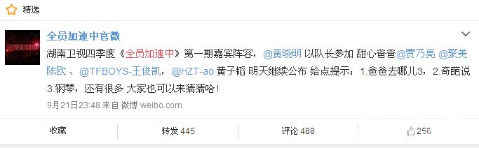 湖南卫视四季度《全员加速中》第一期嘉宾阵容,@黄晓明 以队长参加 甜心爸爸@贾乃亮 @聚美陈欧 、@TFBOYS-王俊凯,@HZT-ao 黄子韬 明天继续公布 给点提示:1.爸爸去哪儿3,2.奇葩说 3.钢琴,还有很多 大家也可以来猜猜哈!