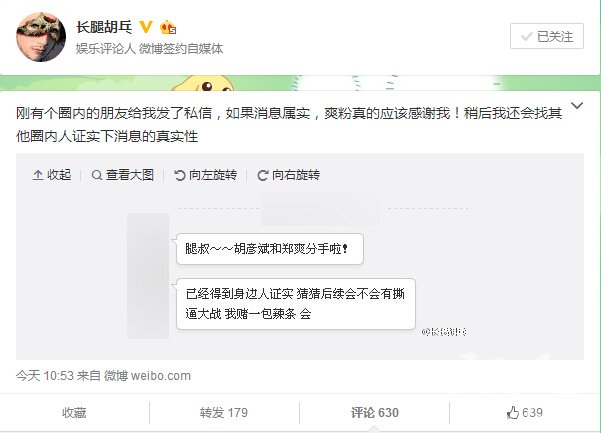 今年8月下旬,有媒体在微博上曝光视频,爆料胡彦斌坐飞机远赴沈阳,并且抵达郑爽家,与郑爽及其父母一同进餐,郑爽还小鸟依人般地依偎在胡彦斌的身上。随后,胡彦斌还被拍到搂着郑爽一起坐在沙发上的亲密场面。胡彦斌环抱着郑爽,还轻抚郑爽的脸庞,甚至不忘送上甜蜜一吻,俨然是一对热恋中的情侣。
