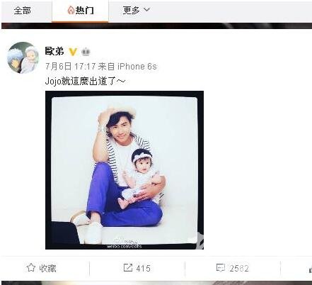 近日,欧弟上传了一张自己和女儿jojo的合照~没几个小时就被网友顶成他自己首页里的热门微博哈哈哈