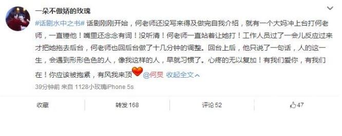 据现场观众透露,之后何炅回到后台做了十几分钟的调整,再次回到舞台,舞台下都是期待何炅精彩表演的观众。在舞台上何炅说了一句话,他称:人的这一生,会遇到形形色色的人,像我这样的人,早就习惯了。让台下的观众感到很心疼。