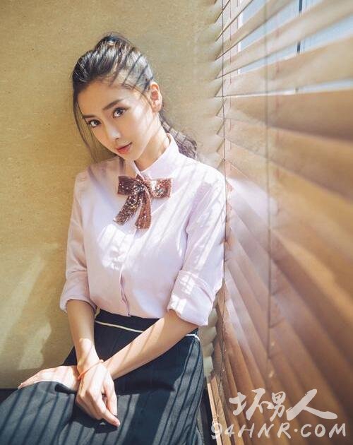 Angelababy关于电影《微微一笑很倾城》的造型,白衬衫、蝴蝶结领带配黑色百褶裙或一字裙,满满的学院风。