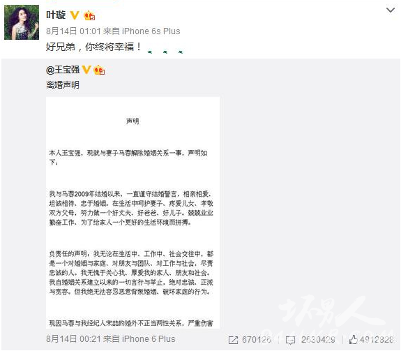 叶璇:在王宝强零点二十分发声明之后四十分钟,叶璇转发王宝强的微博并写道:好兄弟,你终将幸福!叶璇的表态博得了网友的好评,她曾经自曝王宝强是闺密。