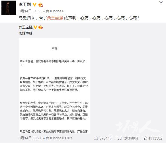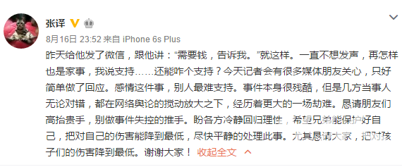 张译:昨天给他发了微信,跟他讲:‘需要钱,告诉我。’就这样。一直不想发声,再怎样也是家事,我说支持……还能咋个支持?今天记者会有很多媒体朋友关心,只好简单做了回应。感情这件事,别人最难支持。事件本身很残酷,但是几方当事人无论对错,都在网络舆论的搅动放大之下,经历着更大的一场劫难。恳请朋友们高抬贵手,别做事件失控的推手。盼各方冷静回归理性,希望兄弟能保护好自己,把对自己的伤害能降到最低,尽快平静的处理此事。尤其恳请大家,把对孩子们的伤害降到最低。谢谢大家!