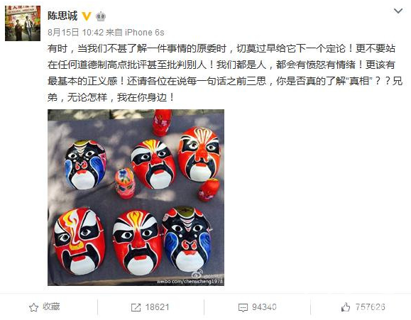 陈思诚:有时,当我们不甚了解一件事情的原委时,切莫过早给它下一个定论!更不要站在任何道德制高点批评甚至批判别人!我们都是人,都会有愤怒有情绪!更该有最基本的正义感!还请各位在说每一句话之前三思,你是否真的了解“真相”??兄弟,无论怎样,我在你身边!