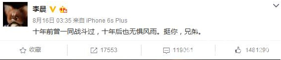 李晨:十年前曾一同战斗过,十年后也无惧风雨。挺你,兄弟。